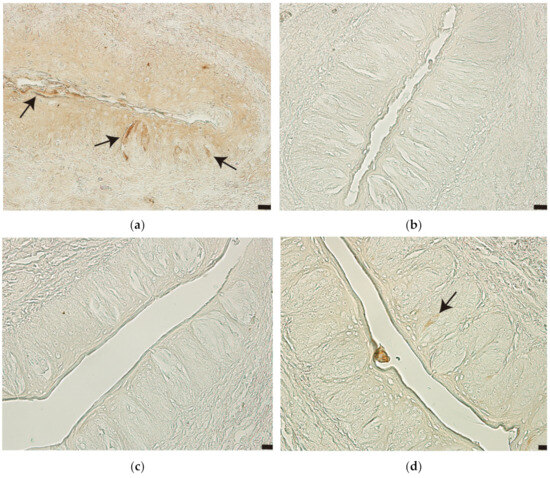 Immunohistochemical staining depicting the presence of cleaved caspase-3 (c-casp3) in different subgroups. The brown coloration, marked by arrows, indicates c-casp3 positive cells. (a) Diabetic control subgroup (STZ); (b) diabetic experimental subgroup (STZ/4HR); (c) healthy control subgroup (Control); and (d) healthy experimental subgroup (4HR). A notably higher quantity of c-casp3 positive cells was observed in the STZ group compared to the other subgroups (Original magnification, ×400 without counterstaining, bar = 20 µm).