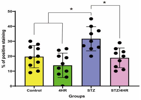 The TUNEL assay and the IHC staining for c-caspase-3 had the same purpose, which was the determination and comparison of the frequency of apoptotic cells in taste buds. The horizontal sections of CVP from each group were immune-stained with an antibody against c-casp3, which is accountable for alterations in shape and biochemical composition during apoptosis. The IHC staining results showed relatively more c-casp3-positive taste cells in the STZ subgroup, as well as in the STZ/4HR subgroup (Figure 5). The results of calculating the percentage of taste buds with stained (positive) cells in relation to the total number of taste buds showed that there was a statistical difference among the groups (Figure 6; p < 0.001). In the post hoc test, the STZ subgroup had a significantly higher number of c-casp3-positive taste cells compared to the control, 4HR, and STZ/4HR subgroups (p = 0.010, <0.001, and 0.007, respectively).