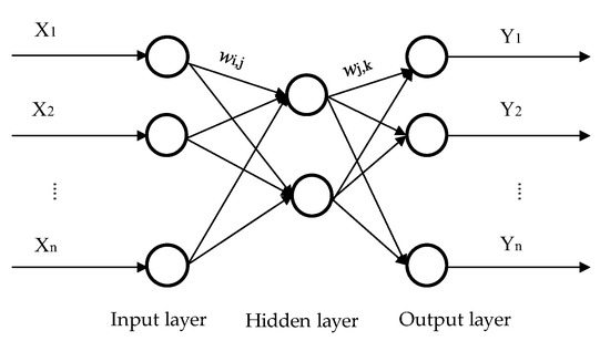 As shown in Figure 2, the BP neural network is a kind of feed-forward network, and the network structure is composed of an input layer, a hidden layer, and an output layer. X1, X2, …, Xn are the input values, Y1, Y2, …, Yn are the prediction values, and wi,j and wj,k are the weights of the BP neural network. The neural network utilizes the network structure and parameters to perform nonlinear learning on the data samples and stores the learning information in the network weights and thresholds, thereby memorizing the development law of the data sequence and realizing the forecast of future data sequences. However, the randomness of parameter selection in the initial training of the neural network is strong, and the correction of weights and thresholds tends to fall into a local optimal solution, resulting in a forecast error greater than the expected error. This optimization defect can be addressed by introducing a GA.
