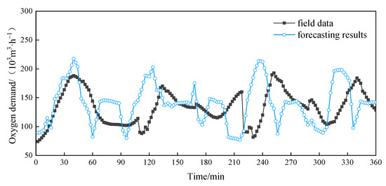 The collected field data were divided into 12 groups for forecasting and verification. Each group of data contained 165 data points, of which the first 150 data points were used as input data for forecasting, and the last 15 data points as verification data for the forecast results. This is equivalent to forecasting the oxygen demand for the next half an hour based on 5 h of historical data. In addition, some of the field data are provided in Table 3 for a better understanding of the input and output of the models.