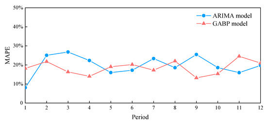 When comparing Figure 3 and Figure 4, it can be seen that both the ARIMA and GABP models can forecast the changing trend of the oxygen demand, but the GABP model performed better than the ARIMA model in terms of coincidence with the field data. To quantificationally compare the forecast accuracy of the two models, the mean absolute percentage error (MAPE) of each of the 12 sets of data was calculated and is shown in Figure 5. The calculation results show that the average MAPE values of the 12 sets of data of the ARIMA and GABP models were 23.8% and 20.2%, respectively. Therefore, the prediction accuracy of the GABP model is better than that of the ARIMA model.