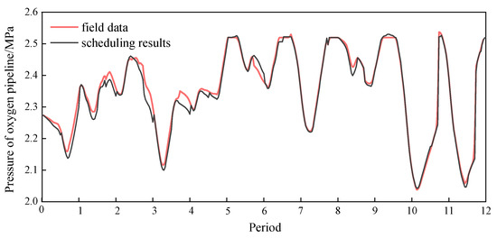 Pressure of the oxygen pipeline: Scheduling results vs. field data.