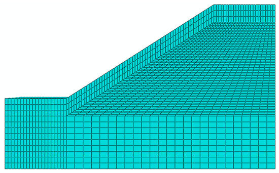 Soil consists of a soil skeleton and voids. Rainfall infiltrating into the voids of the slope soil generates a hydraulic head difference. This difference in hydraulic head induces water flow in the soil, leading to the formation of seepage forces acting on the soil and causing changes in the stress field. The changes in the stress field cause deformation in the soil, resulting in alterations in the internal void volume of the soil, subsequently leading to changes in the soil permeability coefficient, ultimately affecting the soil’s seepage field. ABAQUS analyzes the aforementioned fluid–structure interaction problem based on the principles of mass conservation and the virtual work principle. It adopts a coupling algorithm based on the Biot consolidation theory to compute the equilibrium equation of stress seepage and the transient seepage equation. By combining pore pressure boundaries with flow rate boundary conditions, the finite element equations for the permeability–stress coupling are obtained and subsequently solved.
