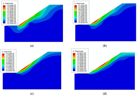 Displacement calculation contour plot with reinforcement considered (unit: m): (a) Condition 1, (b) Condition 2, (c) Condition 3, (d) Condition 4.
