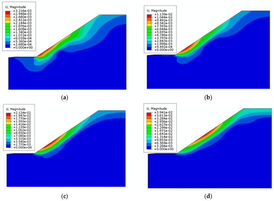 The displacement contour maps considering vegetation root reinforcement for each rainfall condition are shown in Figure 6. The maximum displacements are presented in Table 4. It can be observed from Table 4 that regardless of whether vegetation root reinforcement is considered or not, the maximum slope displacement increases with increasing rainfall intensity. Rainfall intensity is one of the important factors to be considered in slope safety design.