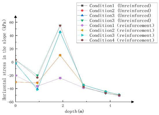 Figure 7 shows the horizontal stress profiles within a depth range of 5 m in the slope, as indicated by the location “1-1” in Figure 1. The horizontal stress profiles within this depth range exhibit an inverted “V” shape, with the magnitude of increase becoming larger as the rainfall intensity increases. A sharp change in horizontal stress occurs within the depth range of 1–2 m. The impact of reinforcement on horizontal stress differs in the surface layer. For rainfall conditions of Case 1 and Case 2, where the rainfall intensity is low, the horizontal stress profiles are nearly overlapped regardless of reinforcement. However, for Case 3 and Case 4, where the rainfall intensity is relatively high, the horizontal stress profiles show separation. At a depth of 0 m for Case 3, the reinforced horizontal stress is reduced by 26.3%. At a depth of 0.9 m, the reinforced horizontal stress increases by 2.9%. At a depth of 1.9 m, the reinforced horizontal stress decreases by 1.4%. For Case 4, at a depth of 0 m, the reinforced horizontal stress increases by 12.0%. At a depth of 0.9 m, the reinforced horizontal stress increases by 16.68%. At a depth of 1.9 m, the reinforced horizontal stress decreases by 0.3%.