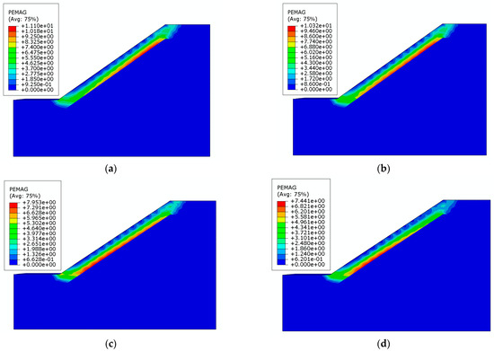 The final plastic zone diagrams for different scenarios under the unreinforced condition are similar. Taking Scenario 4 as an example (represented in Figure 8), it can be observed that the plastic zone is fully connected without reinforcement, and the area with the highest plastic strain values is concentrated at the interface between the weathered layer and the un-weathered layer. The shape of the plastic zone is characterized by regular rectangular strips, with a tendency to extend towards deeper layers.