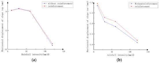 Horizontal displacement change: (a) horizontal displacement of slope top; (b) horizontal displacement of slope toe.