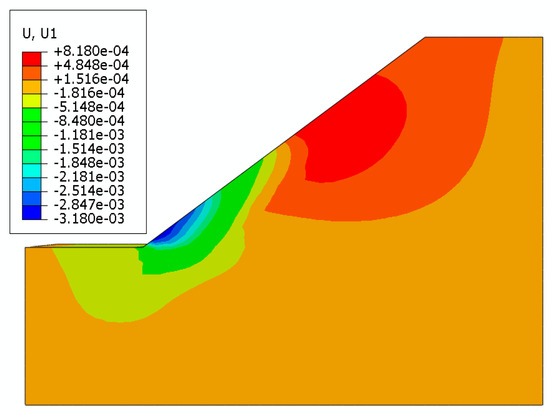 The model is established in ABAQUS, with the slope direction along the negative x-axis. From Figure 10a, it can be observed that with and without reinforcement, the final horizontal displacements at the slope crest for Condition 1 are in the opposite direction to the sliding surface, while for Condition 2, the displacements are also in the opposite direction but larger than those for Condition 1. The sliding pattern appears to be arc-shaped, as shown in Figure 11. The reason for this phenomenon is that after the expansive soil absorbs moisture and expands, its strength decreases, resulting in the formation of a high-stress zone in the surface layer (weathered layer). Under the self-weight accumulation of the slope, sliding occurs first at the slope toe. The vegetation root system increases the stiffness of the surface layer, and the sliding at the slope toe causes rigid body rotation of the surface layer, resulting in displacement of the slope crest along the positive x-axis. From the variations in horizontal displacement at the slope crest and toe, it can be observed that considering root reinforcement can limit the horizontal sliding displacement of the slope.