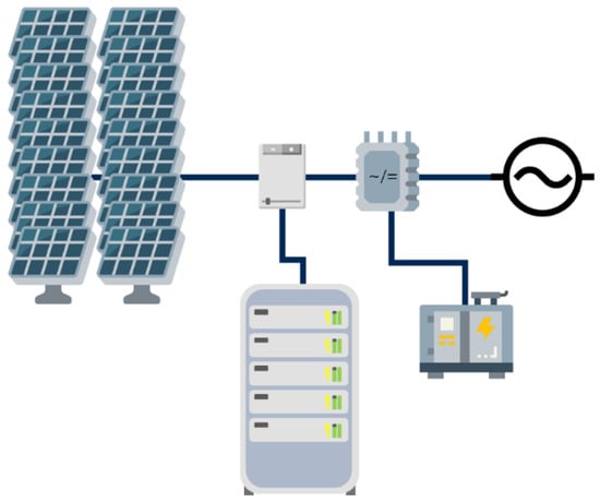 A conventional auxiliary generator is additionally considered to provide energy in the hours in which the main system (PV + batteries) does not meet the supply—in this case, a fuel generator set.