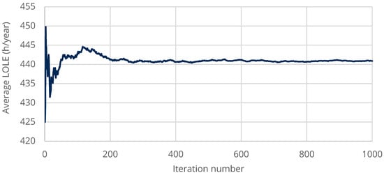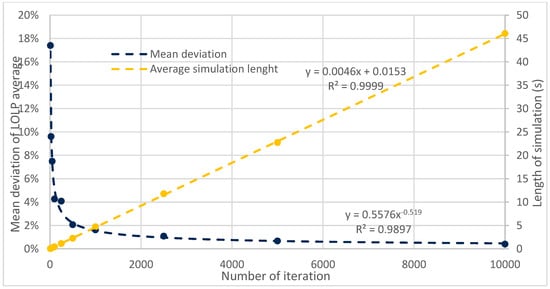 To establish a number of iterations to make the probabilistic calculation with an acceptable error, a study of the standard deviation of the averaged LOLP index is carried out as a function of the number of repetitions, taking into account the time used by the simulation (Figure 3).