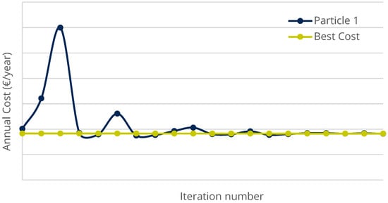 Sequential Monte Carlo simulation is used in this study to assess component faults. The paper’s goal is to size the SAPV system economically optimally while imposing some restrictions on the system’s intended reliability. This study is distinct from previous ones in that it considers actual data from time series on PV generation and load demand in addition to the simultaneous evaluation of uncertainties related to faults in system components. The aim of the design of an SAPV generation system is to guarantee the desired level of reliability in the continuity of the supply. The problem is formulated as a single-objective cost optimization problem, as the reliability of the SAPV system is set as a minimum requirement. To calculate the optimal size of the installation that minimizes investment and operation costs for a minimum established reliability requirement, the application of an evolutionary algorithm (EA) has been considered. An evolutionary algorithm is an optimization method that imitates behaviors of nature to obtain an approximate solution of non-linear complex optimization problems, with a large number of variables or very complex to solve using traditional mathematical algorithms []. The first to be described was the genetic algorithm (GA), although there is currently a wide variety of alternatives, such as the article swarm optimization (PSO) algorithm based on bird behavior, the ACO algorithm (ant colony optimization) based on the behavior of ant colonies, or evolutions and variants of these such as the memetic algorithm (MA). Different studies have been published comparing the EA, both qualitatively [], and comparing the performance in solving optimization problems of different kinds. While, qualitatively, advantages and disadvantages are observed in each one of them, quantitatively, in the studies where the performance of each one of them has been compared, the PSO algorithm on average reaches the solution more quickly and effectively [,]. This fact, added to its simplicity, positions it as the one indicated to implement in this work. The PSO algorithm was devised by Kennedy and Eberhart in 1995 to describe the behavior of fish and birds. It has been used to describe the behavior of complex systems to reach an optimal solution [].
