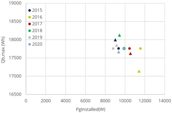 The variables Ps(t) and Pd(t) must be discretized in order to use the analysis method numerically. The energy generated by the PV array is calculated for each hour h of the year, and its value is assigned to the discrete variable Ps(h). Its value can be expressed in both kW and kWh, which are equivalent units of measurement, because it relates to average hourly power. If the discrete values of Ps(h) are used to calculate the GCS(t), then GCS(t) is automatically discretized as GCS(h). An analogous discrete variable, Pd(h), is used to represent the energy required for each hour.