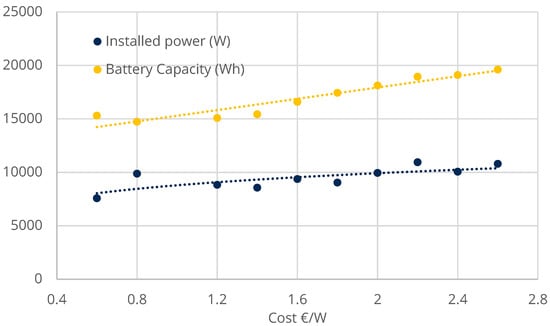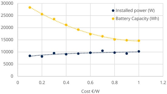 Numerous studies have been carried out to determine the viability of SAPV systems []. There are studies [,,,] that analyze residential PV plants connected to the DN. Through this connection, they can sell energy surpluses to the utility and import energy from the DN as needed. Various studies [,] consider SAPV systems that are autonomous and unconnected to the DN. This is frequently the only choice in many rural areas. Different methods for designing such SAPV systems have been proposed. Finding the most dependable and cost-effective PV unit and battery configuration for energy generation and storage is the main objective. Some authors offer solutions on the basis of equations for the energy balance []. Some of them use statistical techniques to account for variations in solar radiation []. A list of SAPV system-sizing methods can be found in [,].