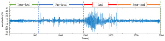 Seizure prediction typically involves recording the patient’s EEG signals in four states: interictal, preictal, ictal, and postictal [10,35] (Figure 1). The interictal period represents the normal brain state, far from seizure activity. Prior to a seizure, the patient’s EEG signals exhibit abnormal fluctuations, known as the preictal phase. The preictal phase transitions from a normal state to a seizure state. The ictal period corresponds to the actual occurrence of a seizure. The postictal phase refers to the transitional period when the brain returns to its normal state after a seizure. Seizure detection based on EEG signals aims to distinguish between the interictal and ictal periods, while seizure prediction focuses on analyzing the preictal state of the EEG signals, specifically performing classification tasks between the preictal and interictal periods.