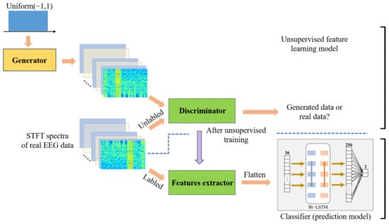 Firstly, the time series data of the EEG signals is transformed into a two-dimensional matrix with time and frequency axes using the STFT. Secondly, the WGAN-GP is used as an unsupervised feature learning model. This model uses Earth-Mover (EM) distance as a measure instead of Jensen-Shannon (JS) divergence to overcome training instability and model collapse issues, ensuring the richness of generated samples [32,33]. Lastly, a Bi-LSTM classification model is employed as the backend classifier, using a small amount of labeled STFT spectrograms to guide the prediction task. This classification model efficiently captures temporal information in EEG signals, thereby improving prediction performance [34].