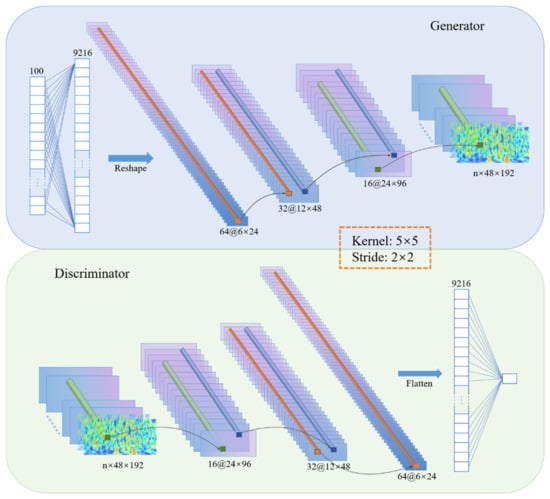 In Equations (3) and (4), is the batch size of 64, is the original STFT of the EEG signal, and is sampled from the distribution . When the network is stable, the data generated by the generator is close to the real time-frequency distribution, and the discriminator has feature extraction ability; that is, the network layers of the discriminator form a feature extractor [28]. Therefore, network training is crucial for improving feature extraction abilities.