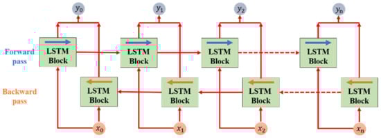 The Bi-LSTM network is an optimized version based on the LSTM. In the Bi-LSTM, a single layer consists of two LSTM blocks that process two sequences of inputs in opposite directions, as shown in Figure 7. The results of the two LSTM blocks in a single layer are combined to compute the final output for the task at hand. The Bi-LSTM takes into account the temporal dependency of the input data, which makes it promising for achieving higher classification results.