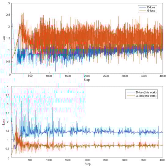 The generator and discriminator of the traditional GAN model, guided by the loss function, continuously play the game of max-min and update by learning against each other until the output is 0.5, at which point the network reaches a stable state and ends the training. The generator’s loss function is denoted as , while the discriminator’s loss function is denoted as . The definitions are as follows: