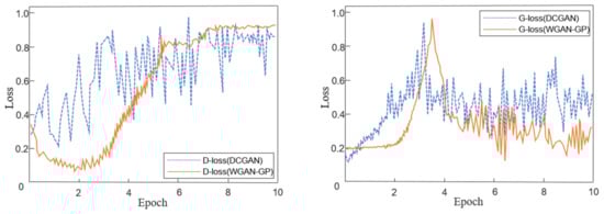 The stability of GAN training is closely related to the variations of Dloss and Gloss and their corresponding gradient changes [33]. Therefore, on the premise of performing STFT preprocessing on the EEG signals, the stability of network iteration training for DCGAN and WGAN-GP generators and discriminators is compared. Figure 11 shows the convergence of Dloss and Gloss after training with two different models on patient 20. Comparing the two, it can be observed that the loss function curve of WGAN-GP has a much smaller oscillation amplitude than DCGAN, and its gradient change trend is also smoother than DCGAN.