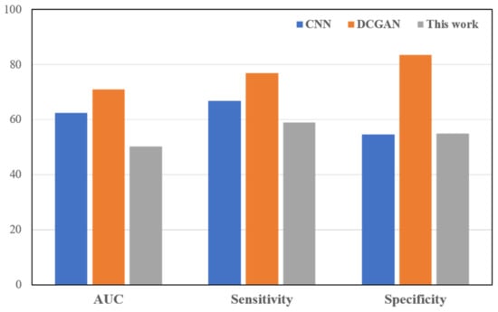 The proposed method in this paper addresses the shortcomings of DCGAN and improves upon the existing semi-supervised prediction model in terms of AUC, sensitivity, and specificity metrics. Additionally, for each evaluation metric, a corresponding analysis of the range of poor values was conducted, as shown in Figure 12. Comparing the proposed model in this study with the fully supervised training CNN [19] and the semi-supervised training DCGAN [28], the proposed model demonstrated lower ranges of poor values in most metrics. This indicates that the model has a smaller range of differences in detecting all patients.