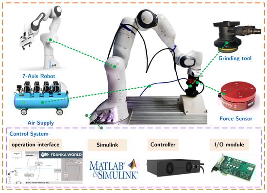 A grinding robot system is established, as shown in Figure 1. A 7-Axis Franka Emika Panda robot is used; a Dynpick 6-Dof force sensor (Type: WEF-6A200-4-RC24, the force measurement range is ±200 N and the moment measurement range is ±4 Nm. Manufacturer: WACOH-TECH. City: Tokyo. Country: Japan.), an analog IO module (Type: NET6043-S, 8-Channel 0-10V analog input module with resolution of 16-Bit. Manufacturer: HKTECH. City: Zhengzhou. Country: China.) and a grinding tool are installed at the end of the robot.
