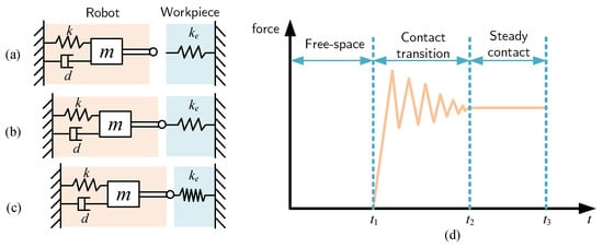 As shown in Figure 2, with the robot and the workpiece set as a spring-damp-mass system, the contact process between the robot and the workpiece can be divided into three stages [50]. Figure 2a shows that the robot does not have contact with the workpiece, and Figure 2b shows the critical point of contact between the robot and the workpiece; the contact force is 0 N, and Figure 2c shows the full contact between the robot and the workpiece. In Figure 2d, From 0 to the contact force between the robot and the environment is 0. From to , after a collision process, the contact force tends to be stable, but the collision process is short and nonlinear.