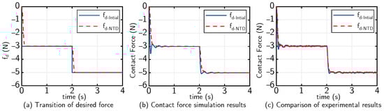 To verify the NTD smoothing effect, we set the parameters of the impedance controller to and . The external environment stiffness was set to . In NTD, , and the simulation time was 4 s. In Figure 4a, the 0–2 s desired force is −3 N, and the 2–4 s desired force is −5 N. In Figure 4b, after NTD smoothing, the overshoot of the force is significantly reduced. The overshoot is reduced from 18.57% to 0.25% in 0–2 s. The overshoot is reduced from 5% to 0.2% in 2–4 s. It is found that the response time is slightly increased, but the system stability is enhanced, which is of great significance for the improvement of workpiece processing quality and system stability. It is verified in the force control system shown in Figure 1; the experimental results are basically consistent with the simulation results, as shown in Figure 4c.