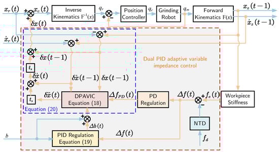 Although NTD is used to mitigate the end overshoot of the robot, it can be found from Figure 4 that there is still overshoot, and improper parameter selection of the adaptive impedance controller will also affect the stability and tracking effect of the system. When the selected mass parameter and stiffness parameter are too large, it will lead to system oscillation, which seriously impede the stability of this system. Moreover, when the stiffness parameter is selected, it will lead to a lower accuracy of the system force control, and it is difficult to ensure that the system’s steady-state error converges to 0. Therefore, PD is used to reduce force tracking, and PID is used to adjust the adaptive update rate. They are real-time synchronous control. The control strategy is shown in Figure 6, and Equation (16) is rewritten as: