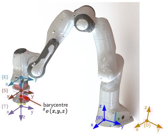 Figure 7 shows the relationship between the world coordinate system , the robot base coordinate system , the end flange coordinate system , the force sensor coordinate system , and the grinding tool coordinate system . The barycenter of the grinding tool is represented as in the system. Using pins to maintain the parallel relationship between the axes of the and system, the homogeneous transformation matrix from to is: