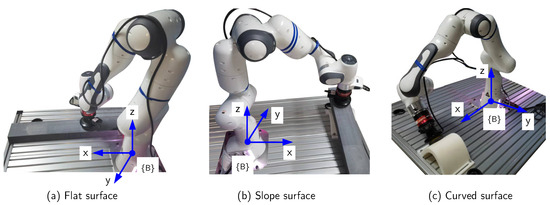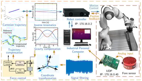 Active force control is the use of designed control strategies to actively control force through the feedback of contact force information [32]. In the aspect of force control algorithms, the design of the force controller is the most important, and the common force control algorithms are impedance control [33,34] and hybrid position/force control [35,36]. For uncertain environments, that is, when the stiffness and position of the environment are unknown, it is difficult to obtain an accurate model, which makes it difficult to achieve high-precision force tracking. There are three main solutions: (1) Indirect adjustment of the reference trajectory: the basic method is to identify environmental information, including stiffness and position [37,38]. (2) Direct adjustment of the reference trajectory: the basic method is to update the reference trajectory with prior information [39,40]. However, this method ignores the dynamic physical characteristics of the robot and the environment and usually results in a large force tracking error. (3) Adaptive variable impedance control: this method adaptively adjusts the controller parameters according to force feedback information [41,42,43]. To improve the accuracy of force tracking, the researchers combined the adaptive algorithm with other force control methods to obtain better force control results [44]. Examples include fuzzy logic control [45], robust force control [46], optimal control [47], etc. Therefore, the key to establish a force tracking controller is to compensate for environmental disturbance, which is oriented to practical applications, and the control method should not be too complicated.