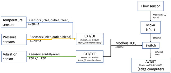 Experimental setup scheme of the axial piston pump with installed sensors. Colors in the scheme correspond with colors on Figure 2. REDNT S.A. modules can be found on the website https://icm.molos.cloud/ (accessed on 10 September 2023).