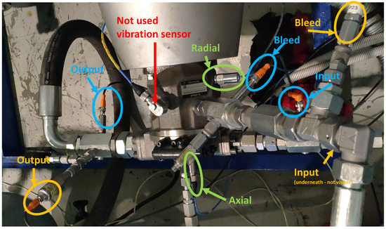 Experimental setup photo of the axial piston pump with installed sensors. Vibration sensors are marked green, pressure sensors are marked orange and temperature sensors are marked blue. These colors correspond with Figure 1.