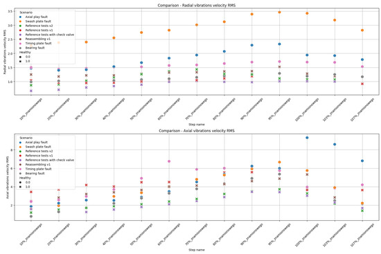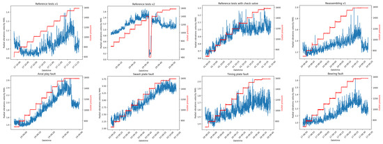 Figure 3 presents the time series of vibration velocity measured by sensor mounted radial and output pressure. All of the experiments followed the same scenarios, but for “Reference tests v2” the load was lowered by mistake in the “Constant load” part for a couple of minutes.