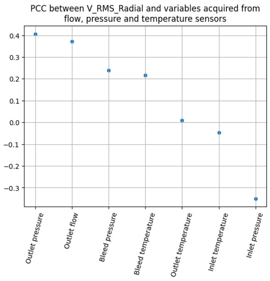 After selecting the most informative vibration sensor and choosing as the output variable of the model, input variables should be chosen. As presented in [33,34], among all the available measured quantities, selecting the most informative ones to improve the quality of the deep learning model prediction could be performed using Pearson Correlation Coefficients (PCC). The higher the PCC absolute value between the output and the input variable, the more useful the input variable is. According to this approach, to select useful variables, PCC between and variables acquired from flow, pressure and temperature sensors were computed. The results are presented in the Figure 5. Among the variables considered, outlet pressure, outlet flow, inlet and bleed pressure are good potential candidates for input variables.