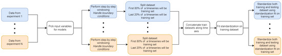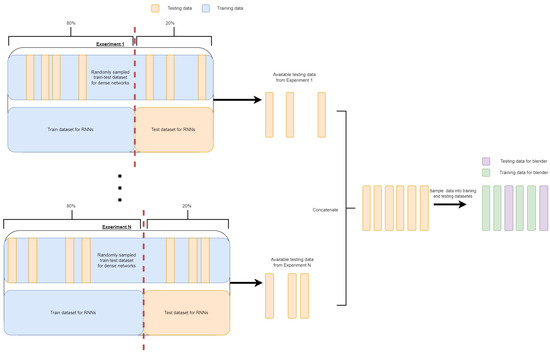 The last approach to prepare the dataset for learning models involves preparation for the training and evaluation of ensemble models, specifically stacking (blending) models. To ensure that blender (strong learner “blending” outputs of ensembles) is trained and evaluated in a way that will not make it positively biased, the training dataset must contain only test data for each of ensemble models. In turn, the test data set must also include only test data for ensemble models. As a result, for each measuring experiment data, only the last 20% of samples of time series were taken into consideration because this data is a test set for RNNs/LSTMs. From this 20%, only values that could be taken into consideration for training blender are examples that were not part of the training nor test set for dense networks. Such carefulness while constructing the dataset prevents data leakage from occurring. Trained blenders do not involve statefulness, therefore the resulting dataset could be randomly sampled in common way. Eighty (80)% of the available data are used for training, and 20% of the available data are used for testing. Standardizing data undergoes the same method as previously outlined. Standardization parameters are estimated on the training dataset and applied to the whole dataset. An illustration of the construction of the dataset for blender training is presented in Figure 9.