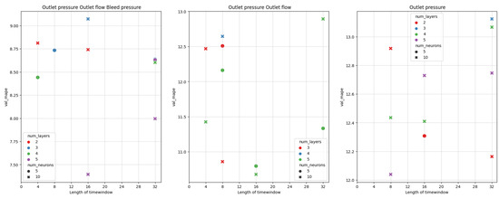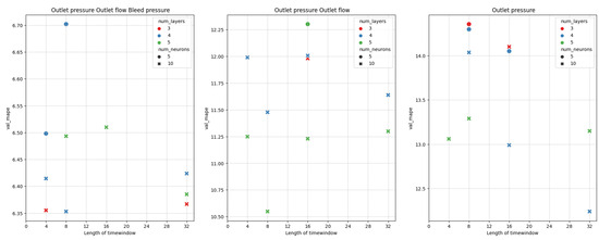 The analysis performed in Section 2.2 leads to the conclusion that is selected as the input, and outlet pressure, outlet flow and bleed pressure are selected as the output variables. It was decided to feed the models with data taken from time windows of a fixed length w, to predict the next sample of . Figure 6 presents this concept. A split was performed for the training and test dataset with a proportion of 80:20, respectively. The data preparation process does not involve the validation dataset. Only the training and test dataset were constructed. Such a decision was made due to the fact that the preparation of the dataset was quite complicated due to the multiplicity of the types of models used. For the analysis using dense neural networks in Section 2.4.1, the extracted time windows were randomly combined. While using recurrent neural networks (RNNs) and long-short-term memory neural networks (LSTMs) in Section 2.5.2 and Section 2.5.3, there was no randomization of extracted time windows. In these cases, the border of the train-test split of the time windows was placed at a time of 80% from the beginning of the experiment (so 20% from the end of the experiment). Datasets for dense-, recurrent- and long short-term networks were standardized based on parameters obtained on their training sets. The analogical procedure was performed for each experiment separately. As data for all experiments was concatenated along the time axis, careful handling of the boundary conditions was performed, so that none of the extracted time windows overlapped over two experiments. Figure 7 schematically shows the dataset preparation for dense networks. Figure 8 presents it for recurrent and long short-term memory networks.