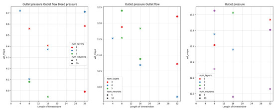 Table 6, Table 7 and Table 8 show that dense networks are significantly characterized by the highest number of training epochs. Some of the dense models even reached the maximum number of training epochs. For such models, training could be continued because there is a probability that performance of the network will increase after a longer training time. Training RNN networks requires fewer epochs than training LSTM networks on average. There is no general rule that the larger the model, the longer the training lasts, however.