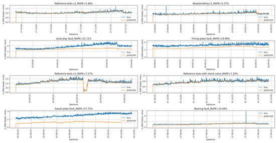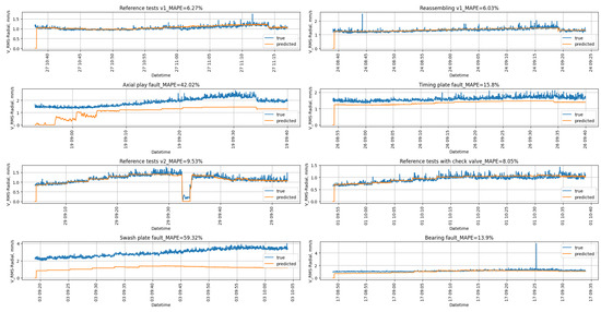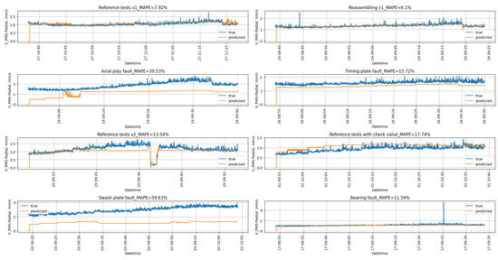 For ensembles of models, metrics were calculated on data from both the training and test dataset for experiments with pump without damage. In terms of MAPE value, the median ensemble performs best among others presented in Table 9. Generally, all of the ensembles performed comparably well, except GB RNN and GB LSTM, which are characterized by significantly worse metric values compared to the other ensembles. The value of a MSE metrics is on a comparable level or even lower than the MAE value. This could lead to the conclusion that outliers are not present in the evaluated dataset. The MAE values for experiments with damaged pumps are several times greater than the MAE metrics for experiments with non-damaged pumps. This property applies to all ensembles. Similarly to the discussion carried out in Section 3.2.1, only for the Swash plate fault experiment, MAE metrics can be a single factor that could be relied on when assessing whether the pump is damaged or not. The MAE value for that experiment is higher than 2.1 , which is significantly higher than for other experiments. It allows one to assess the change in machine condition in confrontation with the ISO norm. In addition, the MAE value for Swash plate fault calculated using any of the implemented ensembles could be a single metric that could indicate the swash plate damage.