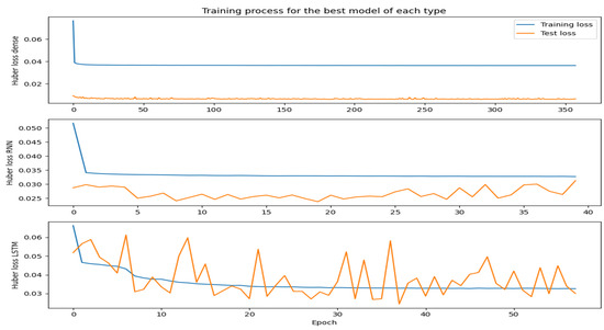 The last important aspect in the context of training networks is training stability. Figure 17 presents the training process for the best models of each type analyzed. The best model here means the model with the lowest MAPE value computed on test set. The properties of the best models of each type are shown in Table 6, Table 7 and Table 8. The least stable training process took place for the LSTM model. The validation loss in this case is noisy and it is hard to conclude the shape of the downtrend of the loss curve. In addition, in Figure 17, the loss calculated over the test dataset for the dense and RNN model is lower than the training loss. This phenomena can occur due to the specifics of the dataset, especially when the test dataset contains more “easy” examples, or regularization is applied as presented in the article [68].