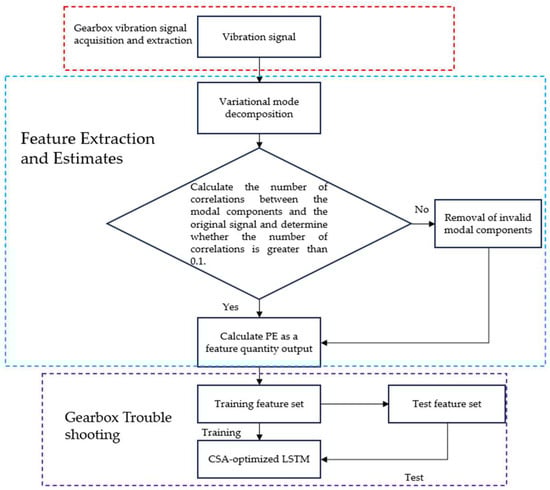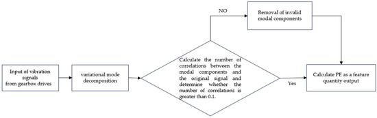 In this study, VMD and PE algorithms were employed to distill the fault characteristics inherent in the gearbox transmission. Figure 2 delineates the comprehensive flowchart outlining the intricate process of feature extraction, expounded in the subsequent steps. This systematic approach ensures a meticulous analysis, shedding light on the nuanced anomalies and operational inefficiencies within the gearbox transmission. The approach is outlined as follows: