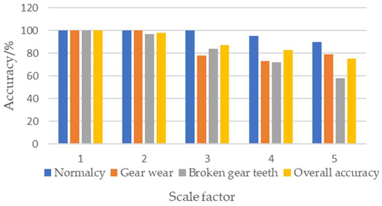 As depicted in Figure 6, there is a marked increase in the correct diagnosis rate correlating with the rise in pressure, consistently peaking at 100%. In such scenarios, the vibration signals of the gearbox transmission are notably susceptible to various forms of interference, leading to the obscuring of essential fault-state information. However, a shift is observed with the augmentation of pressure. Distinctive vibration characteristics, emblematic of varied transmission states, are observed. During this phase, the pervasive influence of interference factors on the overall fault depiction is markedly subdued. This resilient performance amidst escalating pressures underscores the method’s adeptness in meticulously extracting wear-related failure characteristics, attuned to the nuanced variations in lubricant pressure states of transmission. Such robust diagnostic precision reaffirms the method’s validity, positioning it as a reliable asset in intricate fault detection and characterization.