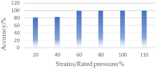 Since the lubricant pressure is not always maintained at the rated pressure during the operation of a gearbox, to verify the effectiveness of the method in the fault diagnosis performance under variable pressure conditions, the method was developed and validated. The effectiveness of the method in fault diagnosis under variable pressure conditions is verified. We selected 20%, 40%, 60%, 80%, 100%, and 110% of the rated pressure of the gearbox transmission vibration data from 750 sets. Using the method proposed in this paper, gearbox transmission wear fault feature extraction and fault type identification were carried out. The diagnostic results are shown in Figure 6.
