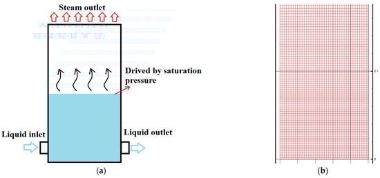 A horizontal-flow flash chamber with three openings, namely, the fluid inlet, fluid outlet, and steam outlet, was studied, as shown in Figure 1a. The chamber length and width were 1 m and 1.4 m, respectively. A structured grid was used in the chamber, as shown in Figure 1b. Four grid sizes were independently tested, and the grid sizes were 3.0, 2.5, 2.0, and 1.5 mm, corresponding to 154,845, 224,000, 350,000, and 620,712 grids, respectively. A grid size of 2.0 mm was selected because of the computational time and clarity of the results.