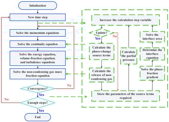 In this study, a multiphase, multicomponent, and pressure-driven Lee phase-change-coupled model was proposed [24]. The governing equations and calculation flowchart are shown in Figure 2. The left side of the chart shows the main governing equations, including the transient momentum conservation equations, mass conservation equation, energy conservation equation, phase fraction conservation equation (VOF model), and the non-condensing gas fraction equation. The right side shows the calculated equations for the phase change and released non-condensing CO2 source term, which is the original model of this work. The phase-change ratio in the conventional Lee model is calculated using the temperature difference (T-Tsat), whereas in this study, Tsat is not a fixed value and is calculated using the local pressure, as shown in Equations (18) and (19). Two types of dissolved components are released (CO2(aq)): supersaturation release and interfacial diffusion release, corresponding to Equations (20) and (23), respectively.