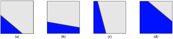 For the four interfacial types, the specific solution processes of the interface area are as follows: (1) the position of the main body of the liquid phase is obtained by the positive and negative values of the gradient components of the phase fraction, and the coordinate system is established with the grid corner of the main body of the liquid phase as the origin; (2) the normal vector and slope of the interface are obtained by the phase fractional gradient; (3) the interface linear equation intercept is calculated using the phase fraction; and (4) finally, the linear equations of the phase interface and the grid intersection are obtained, and the interface area is solved using the Equation (23).