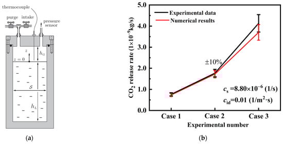 Validation of the numerical model with experimental CO2 release rate data: (a) schematic diagram of the experimental model Re-printed with permission from Ref. [39]. 2014, Elsevier Inc.; (b) comparison of the experimental and numerical results.