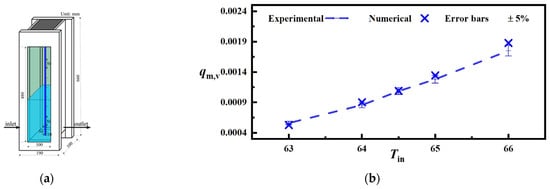 In addition, the flash evaporation process without the presence of non-condensable gases was also compared with the experimental results [40]. The flash chamber for the flow flash evaporation used in the experimental articles compared had an internal flash space of 480 mm in height, 100 mm in length, and 100 mm in width. Five sets of numerical simulation experiments with different inlet temperatures were carried out under the conditions of an initial water-level height of 120 mm and flow rate of 800 L/h. The comparison results are shown in Figure 5 below, and the steam generation rate obtained from the numerical simulation shows a good accuracy.