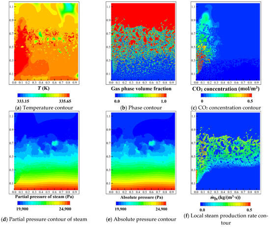 Figure 11 presents the distributions of the CO2 concentration, CO2 interfacial release rate, CO2 supersaturated release rate, and local steam generation rate. Figure 11a shows that the volume fraction of CO2 in gas in the entire flash space is small, which has little effect on the partial pressure of water vapor and did not cause a significant effect on the rate of vapor generation. In addition, as shown in Figure 11b–d, the release rate of CO2 was three to four orders of magnitude lower than the steam generation rate, thus the flow field disturbance by the release of CO2 is not significant.