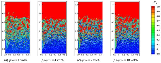 Gas- and liquid-phase distribution for different entrained CO2 volume fractions.